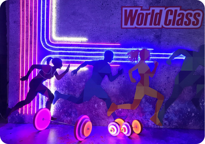 Неоновые вывески очень здорово впишутся в интерьер любого фитнес-центра. Можно изобразить мотивирующие надписи, пиктограммы и даже целые рисунки.