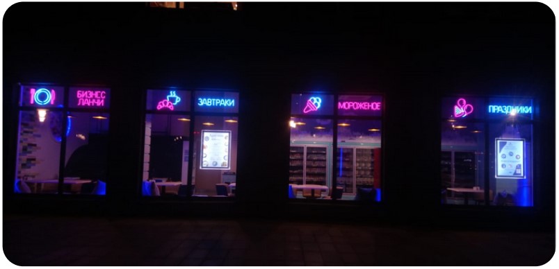 Если же у вас есть название и логотип, то передайте их менеджеру и тогда на основе фирменного стиля можно будет сделать несколько витринных конструкций из неона. Такие вывески удерживают внимание потенциальных посетителей своей яркостью и дополнительно могут рассказать про ассортимент кофейни.