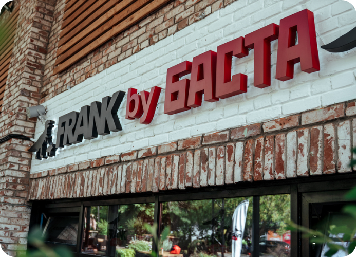 Подходящими материалами для фасадной вывески являются нержавеющая сталь, алюминий и акрил. Подсветка, чаще всего выбирается контражурная, приглушенная, чтобы подчеркнуть изысканность и индивидуальность заведения. А сами стены дополнительно подсвечиваются фасадными светильниками или гирляндами